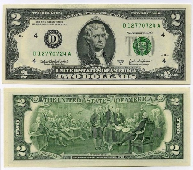 В 1928 году все купюры доллара были изменены в размере, их уменьшили, а сам дизайн сделали стандартным, сегодня купюра мало чем отличается от той, которую придумали в 1928 году. Что касается купюры в два доллара, на ее лицевой стороне изображен Томас Джефферсон (1743-1826), тот самый государственный деятель, который создал «Декларацию независимости» и стал третьим президентом Штатов. А вот на оборотной стороне купюры поместили поместье Джефферсона Монтичелло (от итальянского «Маленькая гора»). Этот особняк был построен по собственному проекту президента, чего там только нет, разные усовершенствованные технические решения. Именно в этом доме «отец Декларации» прожил свои последние годы - 17 лет. Также портрет Джефферсона и его поместье изображены на монете достоинством в пять центов.