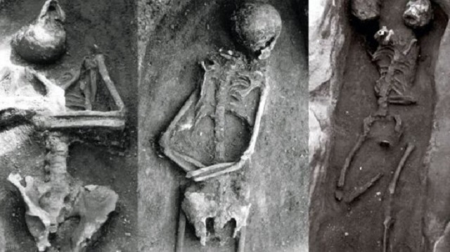 Археологи насчитали 11 ям, в которых были похоронены 13 мужчин в возрасте от 30 до 40 лет. Мертвецы были уложены на бок или на живот, со связанными руками и ногами (сохранились полуистлевшие обрывки кожаных ремней). Так же в сердце каждого погибшего был вбит осиновый кол. С левой стороны рёбра были сломаны. Но это ещё не всё: учёные обнаружили, что уже после смерти (примерно через 2 - 3 месяца) убитым отрубили головы, кисти и стопы. Конечно, сразу появилось предположение о том, что это могила вампиров. Всё характерно - осиновые колья и отрубленные кисти рук и рук, чтоб наверняка.
