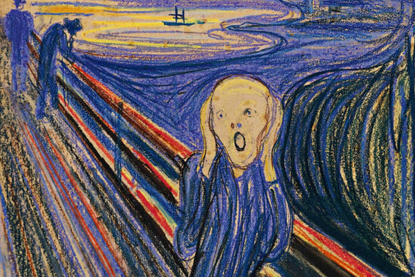 «Я гулял по дороге с двумя товарищами. Солнце садилось. Небо вдруг стало кроваво-красным, и я почувствовал взрыв меланхолии, грызущей боли под сердцем. Я остановился и прислонился к забору, смертельно усталый. Над сине-черным фьордом и городом лежали кровь и языки пламени. Мои друзья продолжали гулять, а я остался позади, трепеща от страха, и я услышал бесконечный крик, пронзающий природу».