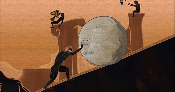 Этим бессмысленным трудом был «награжден» царь Сизиф, всю жизнь потративший на безделье и обман богов. Тогда разгневанные божества обрекли его на вечное занятие - царь должен был загонять гигантский валун на верх горы, который, почти достигнув вершины, неизменно падал обратно вниз. Сизиф был обречен выполнять эту действие вечно.