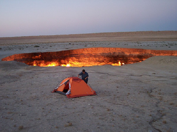 Удивительный кратер был обнаружен в 1971 году, когда геологи нашли месторождение газа. Начались раскопки и бурение земли, однако ученые наткнулись на подземные пустоты. Они образовались во время застывания лавы. Туда, в огромную дыру, провалилась абсолютно вся техника. Через этот проем, случайно открывшийся на земле, стал выходить опасный для людей газ. Чтобы избежать отравления, газ был подожжен, с расчетом на то, что в скором времени запасы закончатся, и огонь потухнет. Однако вот уже почти 50 лет огонь горит с той же силой, что и в 1971 году.