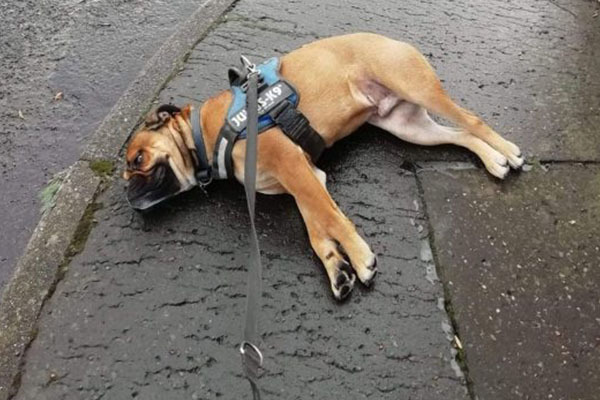 «В прошлую пятницу мой 4-летний бульдог Бегби упал на тротуар, когда я повернул налево, а не направо от тупика. Он понял, что они не направляются в гору к лесу, поэтому отказались двигаться - отворачивая голову «с отвращением». Двое рабочих остановились, чтобы посмотреть, смогут ли они помочь, думая, что он внезапно умер. «Поскольку Бегби лежал на полу, а его голова была отвернута, они думали плохое», - сказал Мишель.
