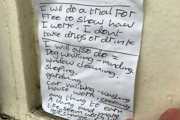 Энтони Джонсон предлагал бесплатные услуги, включая выгул собак, мытье окон, покупок и работу по дому, и просил кого-то "помочь изменить жизнь". 37-летний был бездомным в течение девяти лет и оставил рукописную записку в своей палатке на прошлой неделе, предлагая сделать "все, чтобы заработать на жизнь".