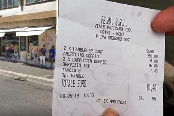 Квитанция показала, что еда для двоих в кафе "Ватикано", недалеко от Ватикана, составила €81.40. Пользователи социальных сетей буквально прихлопнули ресторан за его "вымогательские цены", которые включали €25 за бургер и €8 за капучино. Эмма Чеппи, которая поделилась фотографией чека на Фейсбук, предупредила других туристов избегать это заведение. "Посетители Рима, остерегайтесь!!!" — написала она.