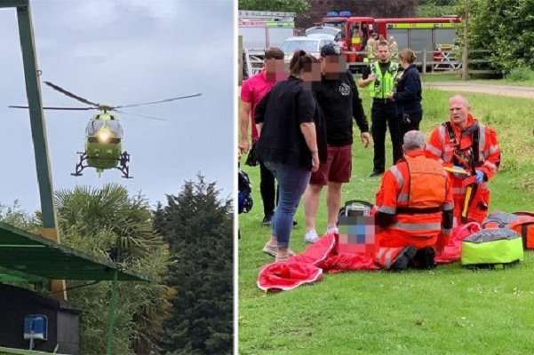 Ребенок в срочном порядке был доставлен в больницу на вертолете после падения с американских горок в Северном Йоркшире, Англия.